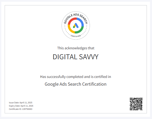 This certification proves our proficiency in running Google Ads Search campaigns, driving traffic and conversions with targeted keyword strategies.